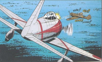 In the story LES JAPS ATTAQUENT Buck Danny engaged his first flight combat against some old japanese Navy biplane dive bomber Aichi D1A. During this first dog fight the Buck Danny's Dauntless entered in collision with one of the Aichi D1A and both the airlanes crashed. |