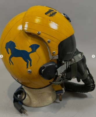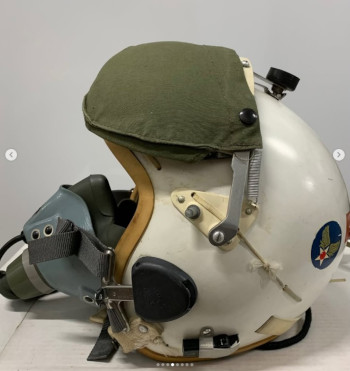| Gold colored and reflective tape added APH-5 dated 1960. This model was equipped with external boom mounted microphone and MS22001 oxygen mask which mount a mini oxygen regulator attached directly under the mask body as used in some US Navy MS22001 models during the late 50s early 60s. |