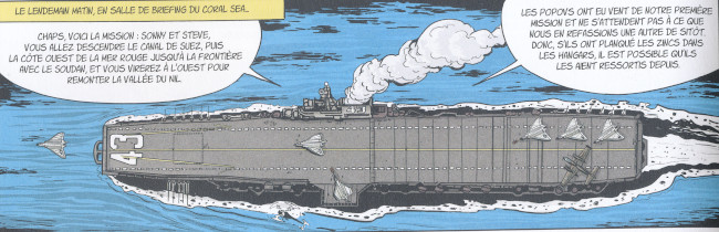 The US Navy nuclear powerd supercarrier USS Ronald Reagan is also shown in the stories LA NUIT DU SPECTRE, DEFCON ONE, VOSTOK NE REPOND PLUS and LE PACTE!. |