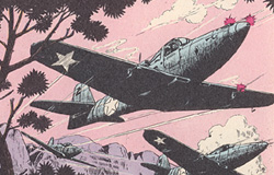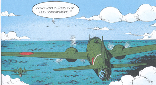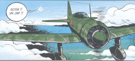 In the story LES JAPS ATTAQUENT a Japanese torpedo bomber Nakajima B5N is depicted attacking an US Navy aircraft carrier. A similar aircraft is more likely depicted in the story LA REVANCHE DES FILS DU CIEL |