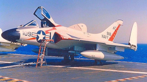 In the story ESCADRILLE ZZ an F8U-1 Crusader From the Naval Air Test Center of Patuxent River is shown as a chase plane of an A3J-1 (later A-5A) Vigilante. |