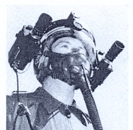 Test pilot Gerald Huelsbeckin 1955 with a modified gun camera mounted on his H-3 helmet. A piece of lead on the other side of the helmet compensates for the extra weight. To take pictures with the electrically operated camera, Huelsbeck merely turns his head toward the subject, usually another plane being tested. Note the communications set up where the microphone plug and headset jack are inserted into a U-61/U female plug on the mask.