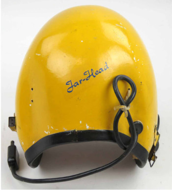 | H-1 later version flight helmet. Note the characteristic and unique curved shape at the rear and the plug on the side of the shell for the oxygen mask communication cable. (Milehigh) |