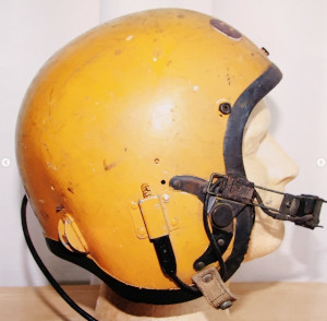 | Gold colored and reflective tape added APH-5 dated 1960. This model was equipped with external boom mounted microphone and MS22001 oxygen mask which mount a mini oxygen regulator attached directly under the mask body as used in some US Navy MS22001 models during the late 50s early 60s. |
