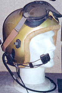 | Early not standardized US Navy flight helmet incorporating communication system and external boom mounted microphone. |