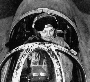 | US Marines pilot John Glenn wearing a P-1A or P-3 helmet while flying on his Panther during the Korean War (US Navy) |