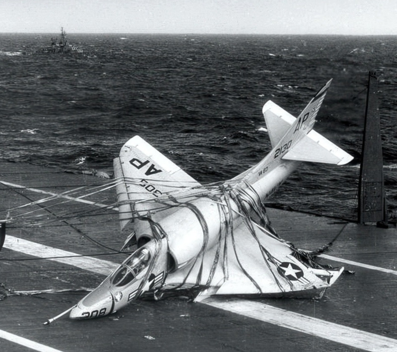A4D-2 Skyhawk of VA-83 after a crash barrier landing aboard USS Essex in 1957. (US Navy) |