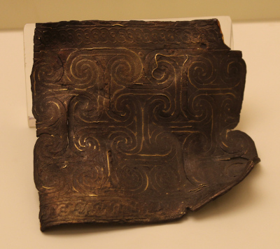 A very interesting pieces of what wery likely was an Aegean bronze war belt dated aroun 1300 BC has been found in the Anatolian settlement of Buyukkale near Bogazkoy. The belt is composed by three layers the two external are in bronze while the middle one is made in silver. The layers are bended to each other on the edge. Inside the grooves of the external decorations gold threads are inserted.The decoration shows very close similarity with some attested in Mycenae and Crete. |