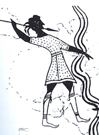 The earliest representation of spears or javelins in the Aegean area are dated from the EM to MM I-MM II (about 2500-1700 BC), like this images of a medium length spear of javelin with triangular point represented on a seal stone from Crete dated from 2500 to 2200 BC. |