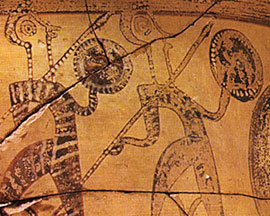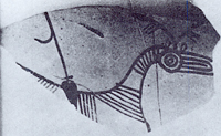 | Some spears with triangular points are also represented in this pottery fragment from Kolonna Aigina dated MH II (about 1800-1650 BC) |