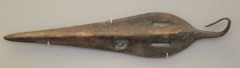 | Spear point from Apolodou Crete dated around 16th century BC. Also the blade of this specimen has been pierced with four holes through which a cord could be threaded in order to fix the point to the spear's wood shaft |