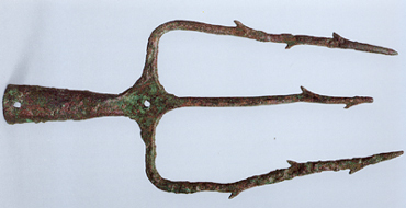 Even if not strictly related with spears or javelins worthy to be mentioned is this beautiful bronze trident from Haghios Nikolaos Crete dated LM IB (about 1450 BC) |