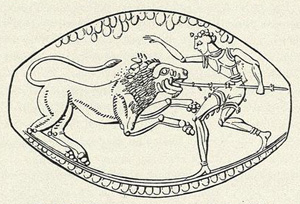 | Another spear with ribbon-like attachment is well represented in this hunting scene engraved on a seal always part of the "treasure of seals" from Thisbe |