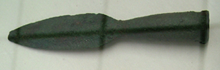 | A bronze javelin point of Group K from Hexalophos dated around LH IIIC. This specimen is 12.5 cm long. A fragment of the wooded shaft is still present inside this point. |