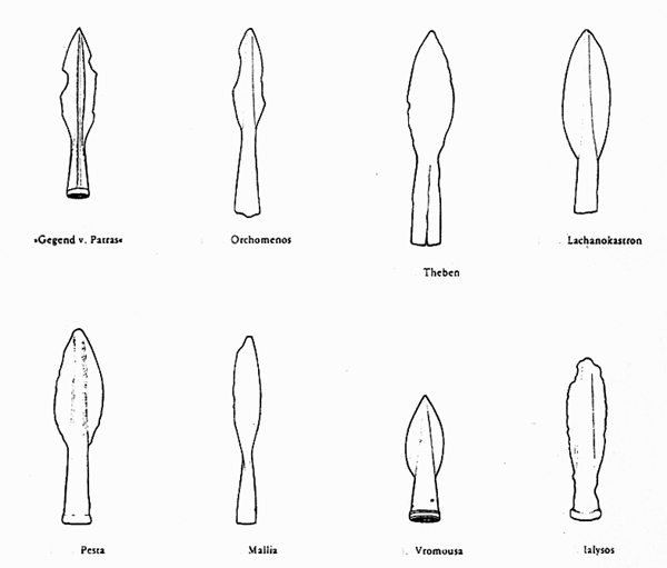 | The spears and the javelings are one of the most common weapons used in the Aegaen area. Copper specimens are attested since the Neolithic period in several archaeological excavations in Greece mainland and Aegean islands. During the Early and middle Bronze Age bronze spear-heads are part of the objects found in the graves of the early Greek settlements like Sesklo and Dimini.