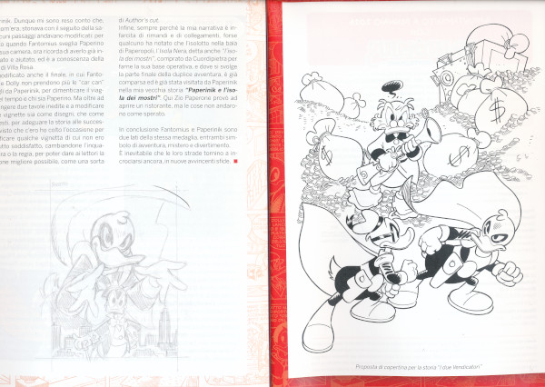 The collection, besides the Fantomallard's saga adventures, re-prints other important stories related to the gentleman thief history and the origin of the character: PAPERINIK IL DIABOLICO VENDICATORE (THE DIABOLICAL DUCK AVENGER), PAPERINIK ALLA RISCOSSA (THE REVENGE OF DUCK AVENGER), PAPERINIK E IL RITORNO A VILLA ROSA (DUCK AVENGER AND THE RETURN TO VILLA ROSE), PAPERINIK E L'OMBRA DI FANTOMIUS (DUCK AVENGER AND THE FANTOMALLARD'S SHADOW) , PAPERINIK E IL TESORO DI DOLLY PAPRIKA (DUCK AVENGER AND THE TREASURE OF DOLLY PAPERIKA), PAPERINIK E IL SEGRETO DI FANTOMIUS (DUCK AVENGER AND THE SECRET OF FANTOMALLARD). Unfortunatelly the important story PAPERINIK TUTTO COMINCIÒ COSÌ (DUCK AVENGER IT ALL STARTED LIKE THIS) is not present in this colection while it has been re-printed the Danish story THE LEGACY (FANTOMIALD LA LEGENDE) which show the alternative "macrocephalus" version of a Fantomallard who is not related with the original one created in Italy by Guido Martina and his life and time saga by Marco Gervasio. |