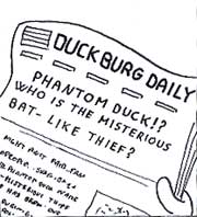 | Nel frattempo ecco giungere Paperone che tanto per cambiare accusa il nipote di essere uno scansafatiche e di essersi imboscato a dormire mentre un misterioso ladro vestito da pipistrello lo rapinava spargendo il terrore in tutta la fiera. Paperino fingendo noncuranza si allontana con il bottino ma viene fermato da un addetto al camion della nettezza urbana che ignaro del contenuto prende il bidone dal carretto di Paperino e senza preavviso lo getta nel camion tritatutto! |