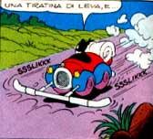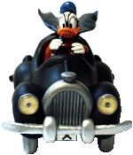 Chiaramente anche il Paperino guidatore è stato adeguatamente modificato con il più appropriato costume da vendicatore mascherato. |