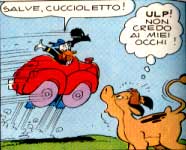 | Paperinik utilizza nuovamente il gas cangiante per far diventare la vettura completamente nera nella storia di Gervasio e Pastrovicchio PAPERINIK E LA DISFIDA DI VILLA ROSA. |