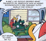| Nella storia dei danesi Rune Meikle e Flemming Andersen PAPERINO E IL GRANDE VENDICATIK TOP. n°2708 Ottobre 2007 Paperino sfrutta la passione dei suoi tre nipotini per il super-eroe televisivo Vendicatik assumendone le sembianze in modo da plagiare Qui Quo Qua ai suoi voleri. |