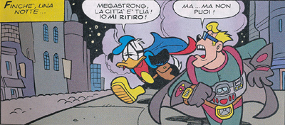 Un tale Jack Strong sembra possedere i giusti requisiti, quindi dotatosi di un apposito costume e vari marchingegni prodotti dalla ditta SUPERSUPERSTORE diventa ufficialmente Megastrong aiutante di Paperinik. In poco tempo il nuovo "super" eroe surclassa in fama il papero mascherato diventando il nuovo idolo dei cittadini. Alla fine comunque Paperinik salvando Megastrong da ua pericolosa situazione riacquista la fama di principale "super" eroe paperopolese |