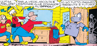 | Nella storia di Martina/Cavazzano ARCHIMEDE PITAGORICO E IL GENIO INCOMPRESO TOP. n° 910 06/05/1973, Durante la ricerca del segreto del totem decatitato la Banda Bassotti, dopo aver invano cercato di introdursi nel deposito di Paperone, cercano di scoprire tale segreto minacciando Archimede che finge di accontentarli facendoli interloquire con un Robot Genio di sua recente invenzione. |