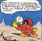 Lo scienziato che ha ideato l'apparecchiatura riesce ad isolare il vero Paperino, che però viene proiettato in un luogo sconosciuto che sia lo scienziato che lo sfortunato papero credono si tratti di Saturno. Mentre i nipoti e lo scenziato preparano il razzo per la missione di soccorso, Paperino riesce a raggiungere il vettore e, credendo che sia appena arrivato per riportarlo sulla terra, vi sale a bordo finendo così insieme ai nipotini ed allo "stordito" scienziato veramente su Saturno. |