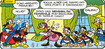 | Nell'assurda storia di Concina /Scala PAPERINIK E IL PRIMO GIORNO DI SCUOLA TOP. n° 1285-1286 13-20/07/80, un grottesco Paperinik per evitare di frequentare le elementari progetta un piano con la complicità del suo amico Archimede. |